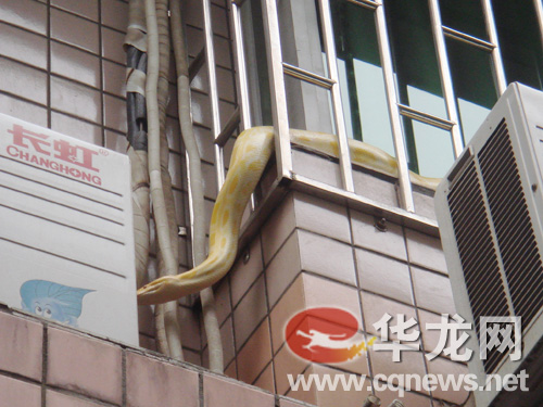 15日下午14時30分左右,潛居20多年的寵物蟒蛇,趁主人不在家,跑到一居民樓的陽臺上“曬太陽”,這只金黃巨蟒在重慶市江津區(qū)天香街引起了一陣騷動。