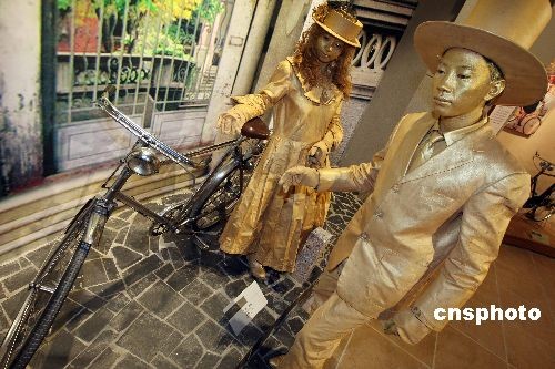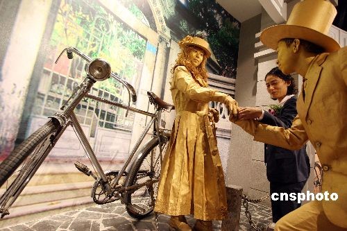 10月28日,行為藝術(shù)者在河北省霸州市新落成的華夏民間收藏館自行車博物館內(nèi)表演,表演者倚靠的是著名民間收藏家王明璽老人收藏的1910年英國生產(chǎn)的白金人牌自行車。該車只生產(chǎn)了100輛,進入中國10輛,這是目前發(fā)現(xiàn)保存最為完好的一輛。當(dāng)日,第二屆霸州文化藝術(shù)節(jié)在河北省霸州市隆重開幕。中新社發(fā) 毛建軍 攝