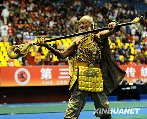 10月31日,88歲的劉子均在表演奇門兵器——羊角骶。當(dāng)日,正在湖北省十堰市舉行的第三屆世界傳統(tǒng)武術(shù)節(jié)開始武術(shù)比賽。來(lái)自中國(guó)武術(shù)協(xié)會(huì)代表隊(duì)88歲的劉子均習(xí)武70多年,他在比賽中表演的羊角骶藝驚四座。新華社記者余國(guó)慶攝