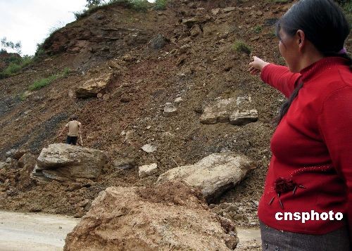 圖為3日記者在趕往災(zāi)區(qū)途中,行至云南南澗縣至景東縣的公路邊,當(dāng)?shù)匾晃淮迕裰v述2日泥石流發(fā)生時的景象。