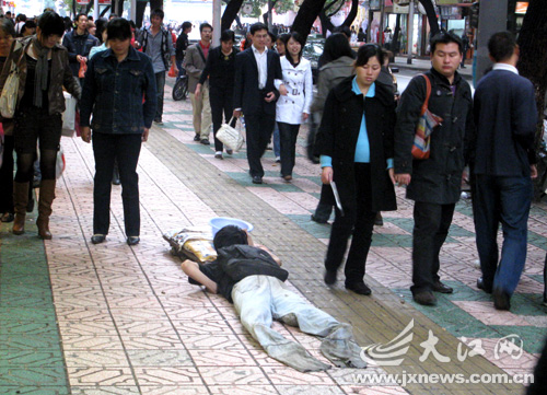 3日下午5時許,一個20出頭“高位截肢”的小伙艱難爬行在南昌市中山路人行道上,向路人訴說不幸遭遇:“一場車禍奪走了父母的生命,我也因這場車禍高位截肢!币恍┖眯氖忻褚姞,紛紛慷慨解囊。傍晚6時30分許,“截肢”小伙爬進了一條小巷內,另一男子提來了一大包衣服。這時,“截肢”小伙突然站了起來,換上一套時尚的休閑裝?吹接浾吲恼眨瑑扇搜杆傧。(文/圖劉虎記者歐陽蘇敏)