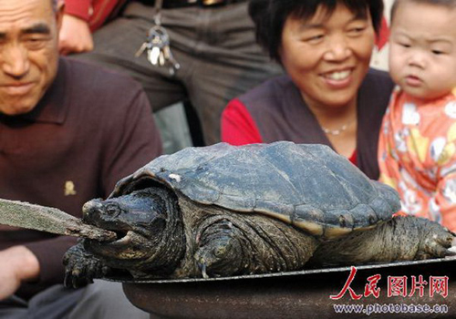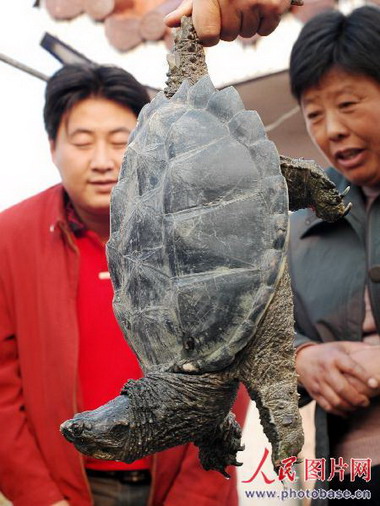 2008年11月4日,一只大“怪”龜引來眾人觀奇。這只重11.4斤的“怪”龜背部像烏龜、腹部像甲魚、尾巴又像穿山甲,是江蘇省姜堰市溱湖風(fēng)景區(qū)湖南村村民孫鳳林上周在湖中扒土?xí)r挖出的。據(jù)當(dāng)?shù)厮a(chǎn)工程師介紹初步認(rèn)定,它屬一種相當(dāng)稀少的大鱷龜,主要生存在南美洲一帶,其生性暴躁、殘忍、什么東西多吃,在水中所向無敵,建議不要進(jìn)行人工放流。