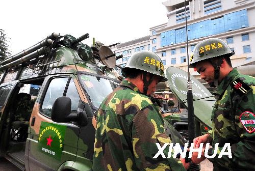 在云南楚雄等地發(fā)生滑坡泥石流災(zāi)害后,云南民兵預(yù)備役應(yīng)急通信分隊(duì)派出安裝著地理信息、GPS定位、衛(wèi)星圖像傳輸、微波無(wú)線通信等車載工作系統(tǒng)組合的移動(dòng)指揮車及數(shù)輛前方信息偵察車,用科技手段為救災(zāi)工作提供精確信息和清晰圖像。新華社記者 陳海寧 攝