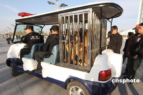11月6日,一輛帶著警犬籠的警用電瓶車在“鳥巢”巡邏。近日,一支由“警犬電瓶車”、警用電動(dòng)自行車組成的“車輪上的巡警隊(duì)”出現(xiàn)在北京奧運(yùn)中心區(qū)里。而民警在巡邏中一般不攜帶警用匕首和手槍,這在全國巡警隊(duì)伍中也是少見的。如有游客因急事求助,民警駕駛的巡邏車可招手即停。 中新社發(fā) 吳芒子 攝
