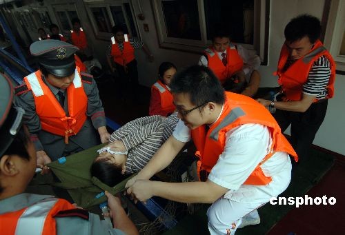 圖為救援人員緊急將傷者用擔(dān)架抬離出事船只。
