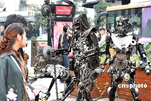 11月8日,由裝置藝術(shù)家周峰先生創(chuàng)作的九件“汽車零件機器人”在浙江杭州西湖創(chuàng)意市集上首次集中展示,嶄新的藝術(shù)創(chuàng)作形式吸引了眾多的眼球。據(jù)了解,近年來,作者大量收集汽車、摩托車上的廢舊金屬零件進行焊接組合,創(chuàng)作了無敵戰(zhàn)士、恐龍、眼鏡蛇等一批風格獨特的“機器人”。中新社發(fā) 李忠1 攝