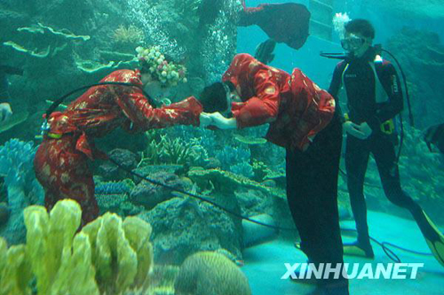 11月8日,在合肥漢海極地海洋世界,一對新人身著特制的中式禮服,在由專業(yè)潛水員擔任的伴郎、伴娘陪伴下,在“海底”完成了一場浪漫、奇妙的婚禮。