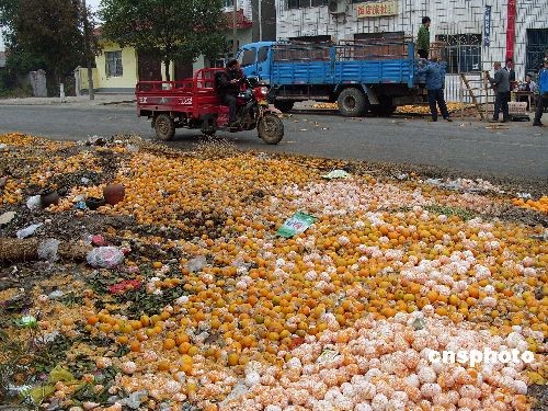 2008年11月10日,湖北宜昌市夷陵區(qū)鴉鵲嶺鎮(zhèn),被當(dāng)成垃圾傾倒在路邊的柑橘隨處可見。據(jù)悉,受四川廣元“蛆柑”事件影響,沒有出現(xiàn)疫情的湖北省柑橘外銷曾一度全面停滯,經(jīng)有關(guān)有關(guān)部門“救市”后,目前銷售量已恢復(fù)到正常水平的85%,但柑橘收購(gòu)價(jià)較往年暴跌,而且收購(gòu)商對(duì)柑橘的大小、品相等要求嚴(yán)格,導(dǎo)致大量“等外品”柑橘被當(dāng)成垃圾倒掉,經(jīng)濟(jì)損失慘重,成為橘農(nóng)們的錐心之痛。中新社發(fā) 劉君鳳 攝