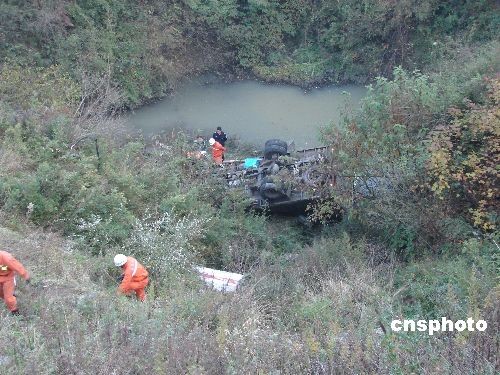 11月12日下午5時許,一輛從貴州省六盤水市駛往畢節(jié)地區(qū)威寧縣的貨車在102省道威寧縣境內張家村一轉彎道突然失控,一頭將路邊的防護石墩撞垮,翻下50余米高的山谷,當場造成2人受傷,1人遇難。中新社發(fā) 潘立遠 攝