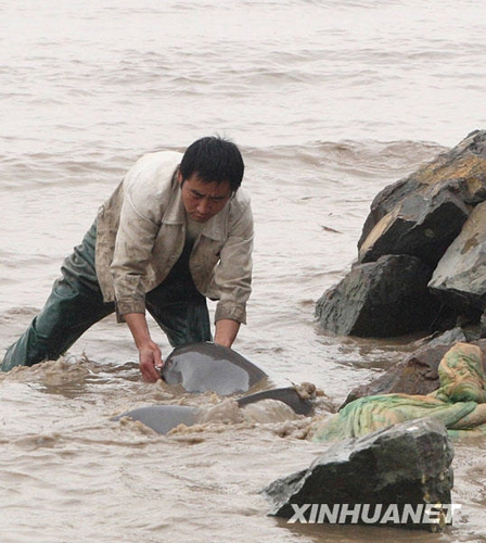 11月12日,3位漁民借助棉被將擱淺江豚轉(zhuǎn)移到安全地帶。 當(dāng)日,在杭州灣海鹽段灘涂,一條擱淺江豚在3位漁民的及時幫助下,重回大海。新華社發(fā)