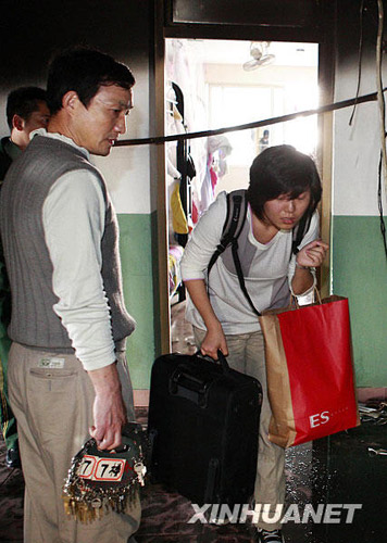 一名女生在火災(zāi)后從宿舍向外搬運(yùn)行李。