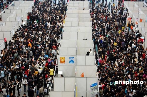 11月15日,由重慶市大學(xué)中專畢業(yè)生就業(yè)指導(dǎo)服務(wù)中心聯(lián)合學(xué)校、企業(yè)與職業(yè)生涯發(fā)展機(jī)構(gòu)等多方力量,共同為09屆的高校畢業(yè)生籌劃舉辦的雙選會(huì)系列活動(dòng),首場(chǎng)也是規(guī)模最大的一場(chǎng)雙選會(huì)在陳家坪展覽中心舉行,萬余人次09屆畢業(yè)生參加。 從招聘會(huì)上看到,由于受到全球金融危機(jī)的影響,企業(yè)紛紛“瘦身”,大幅縮減招聘人數(shù),畢業(yè)生面臨“僧多粥少”的局面,就業(yè)遭遇寒流。中新社發(fā) 許康平 攝