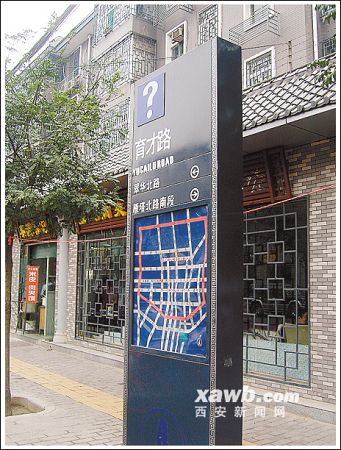 18日下午,大雁塔附近的育才路路口一個約2米高的黑色簇新路牌引人注目,不時有游客打扮的人上前查看道路信息。但是,路牌“育才路”三個漢字上方標示的一個大大的白色“?”號,引起了不少查看者的疑惑。兩名游客先是在路牌下方的城區(qū)交通旅游圖上尋找著“育才路”的方位,而后又仰頭看著“大問號”撓起了頭:“咱們現(xiàn)在是在育才路上嗎?這不會是表示路名待定吧……”