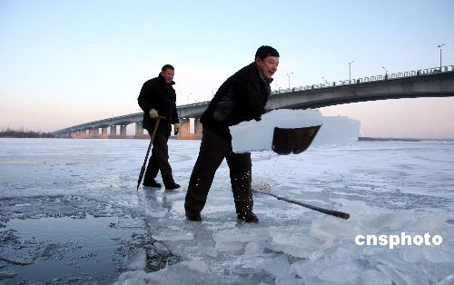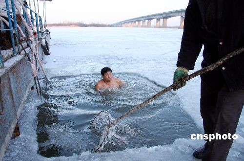 早晨冬泳人砸開冰面往外撈冰