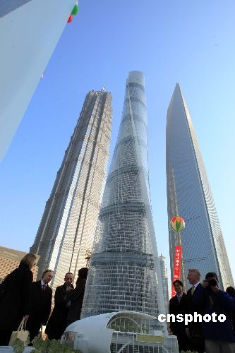 11月29日,中國第一高樓——“上海中心”在上海陸家嘴金融貿(mào)易區(qū)腹地開工,該超高層建筑總高度將達632米,將與毗鄰的超高層建筑“金茂大廈”、“環(huán)球金融中心”,形成“三足鼎立”美景,圖為開工儀式上,中外嘉賓搶先觀賞這一“上海新景觀”。據(jù)介紹,“上海中心”總投資額預(yù)估高達148億元人民幣,外觀螺旋造型象征中國和諧的文化精神。預(yù)計2012年結(jié)構(gòu)封頂且部分投入運營,2014年竣工交付使用。中新社發(fā) 潘索菲 攝