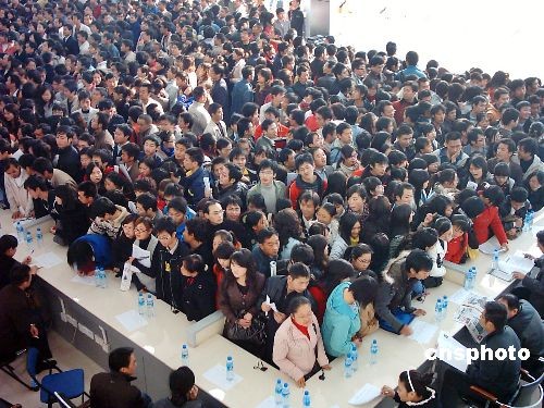 貴陽市某人力資源市場舉行的首場招聘會上,前來求職的返鄉(xiāng)農(nóng)民工和大學(xué)生擠滿了整個人才市場。經(jīng)過精心籌備,使當(dāng)天進(jìn)場招聘的單位達(dá)80余家,提供保安、保潔、廚師、服務(wù)員、焊工、建筑等崗位800多個。由于近段時(shí)間從外省返鄉(xiāng)的農(nóng)民工不斷增多,即將畢業(yè)的大學(xué)生和社會失業(yè)人員的求職需求也比較大,使得當(dāng)天的招聘會異;鸨,進(jìn)場招聘和求職的人員達(dá)到數(shù)千人,將人才市場擠得水泄不通。中新社發(fā) 彭年 攝