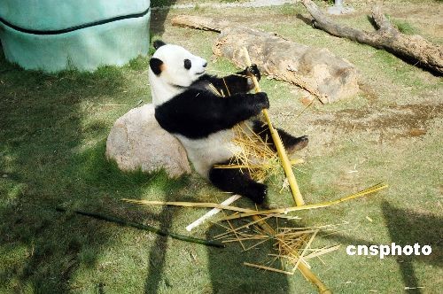 2008年12月3日,生活在福州熊貓世界的四川臥龍地震災(zāi)區(qū)大熊貓悠然自得進(jìn)食。由于福州氣溫與四川比較接近,且有多年實(shí)踐走出來(lái)的一條熊貓飼養(yǎng)成功之路,來(lái)自地震災(zāi)區(qū)四川臥龍的4只大熊貓?jiān)诟V菪茇埵澜缃?jīng)過(guò)近半年的治療休養(yǎng)很快適應(yīng)了福州生活,身體與精神狀態(tài)逐步恢復(fù)到震前情況。中新社發(fā) 張斌 攝