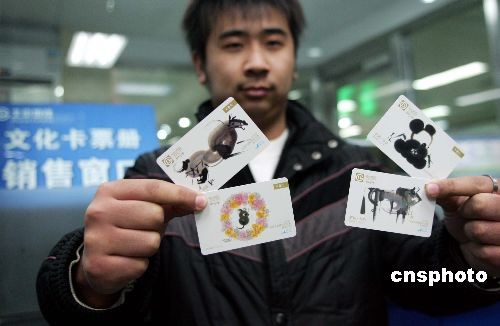 12月6日,北京市地鐵運(yùn)營公司開始發(fā)行4000冊紀(jì)念文化卡票,每冊280元,這是北京軌道交通運(yùn)營38年來首次發(fā)行紀(jì)念文化卡票。除機(jī)場線4個站外,北京地鐵7條線的119個站點將同時發(fā)售紀(jì)念卡票。紀(jì)念卡票特邀韓美林擔(dān)綱設(shè)計,冊內(nèi)收藏北京地鐵紀(jì)念文化卡票4張,設(shè)計以“奧運(yùn)與地鐵”文化創(chuàng)意為主線,選農(nóng)歷戊子年“鼠”為首頁,以“熊貓、耕牛、駿馬”為圖,分別呈現(xiàn)“和諧、平安、耕耘、開拓”。中新社發(fā) 富田 攝