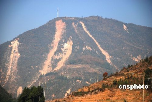 12月,在四川青川縣關(guān)莊鎮(zhèn)的白石河停車場(chǎng)可以清晰地看到遠(yuǎn)山滑坡體垮出的“青川”二字。中新社發(fā) 熊芙蓉 攝