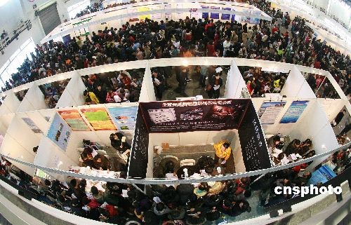12月14日,2009年北京地區(qū)畢業(yè)研究生專場供需見面、雙向選擇招聘會(huì)在中國國際展覽中心舉辦,本次招聘會(huì)有700余家單位參會(huì),提供14228個(gè)崗位,其中碩士學(xué)歷需求人數(shù)占總需求人數(shù)的92.4%,博士學(xué)歷需求人數(shù)占總需求人數(shù)的7.6%。據(jù)介紹,當(dāng)日參加招聘會(huì)的研究生免費(fèi)入場,僅上午已經(jīng)有兩萬多名研究生前來應(yīng)聘。中新社發(fā) 陳曉根 攝