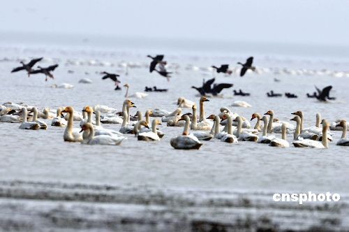 十二月十四日,數(shù)萬(wàn)只小天鵝、雁類(lèi)等珍禽候鳥(niǎo)在鄱陽(yáng)湖候鳥(niǎo)保護(hù)區(qū)江西星子縣沙湖山沙湖池越冬棲息。入冬以來(lái),中國(guó)第一大淡水湖江西鄱陽(yáng)湖區(qū)八大湖池越冬棲息的珍禽候鳥(niǎo)總數(shù)已逾過(guò)十萬(wàn)只,包括白鶴、白鸛等國(guó)家一級(jí)保護(hù)鳥(niǎo)類(lèi),以及雁類(lèi)、鷸類(lèi)、小天鵝、野鴨等珍禽候鳥(niǎo)。目前每天仍有眾多候鳥(niǎo)從中國(guó)北方等地陸續(xù)飛抵鄱陽(yáng)湖越冬。中新社發(fā) 段長(zhǎng)征 攝