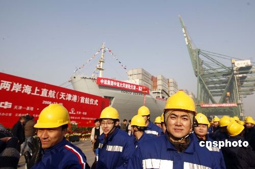 12月15日,海峽兩岸海上直航首航儀式在天津市天津港舉行。據(jù)悉,當(dāng)日舉行首航儀式的,大陸有天津、上海、太倉(cāng)、福州、廈門(mén)、泉州6個(gè)港口,臺(tái)灣有基隆、高雄2個(gè)港口,參加首航的船公司13家,其中大陸9家公司15艘船舶,臺(tái)灣4家公司5艘船舶。中新社發(fā) 盛佳鵬 攝