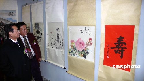 “兩岸文化交流展暨文化創(chuàng)意產(chǎn)業(yè)論壇”十九日在北京開幕,展出了蔣介石、宋美齡、馬英九、連戰(zhàn)等兩岸名流的書畫作品。中新社發(fā) 徐長安 攝