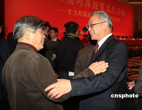 12月20日,第四屆兩岸經貿文化論壇在上海開幕,臺灣記者熱情問候與會的張銘清(右)先生。中新社發(fā) 潘索菲 攝
