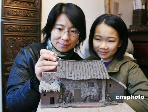 12月21日,市民正在欣賞紫砂雕塑《陶都特色民居》。為了再現(xiàn)昔日陶都特色建筑風(fēng)貌,江蘇宜興工藝美術(shù)師周定芳先后用4個多月的時間,以當(dāng)?shù)靥赜械淖仙澳嗨茉炝艘唤M造型各異的陶都特色民居,藝術(shù)地展示了宜興的地方風(fēng)情,觀者無不稱奇。宜興是我國著名的陶都,陶瓷業(yè)十分發(fā)達(dá),但生產(chǎn)過程中總會產(chǎn)生一些廢品,特別是過去窯爐較落后,廢品較多。在舊時,當(dāng)?shù)厝罕姵S脧U棄或破碎的陶缸、陶甕、陶罐等作為建筑材料來建造墻壁等,造就出富有濃郁地方特色的陶都民居,成為宜興一絕。隨著時代的變遷,此種特色民居不斷被高樓大廈所替代,已越來越少。中新社發(fā) 丁煥新 攝