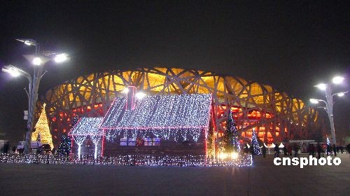 2008年12月23日晚,北京奧運(yùn)公園109棵圣誕樹(shù)及圣誕小屋與“鳥(niǎo)巢”“水立方”交相輝映,構(gòu)成一幅璀璨迷人的畫(huà)卷,充滿濃郁的節(jié)日氛圍。中新社發(fā) 玉龍 攝