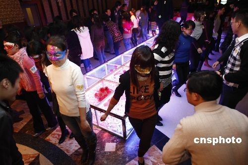 12月27日,百余名單身青年在北京參加一場(chǎng)化妝舞會(huì)。年輕人在歡快的樂(lè)曲中翩翩起舞。面具下的女青年拋開(kāi)羞澀,與男舞伴竊竊私語(yǔ)。該活動(dòng)的初衷也是為了引導(dǎo)年輕人在擇偶時(shí)拋開(kāi)外在條件,認(rèn)識(shí)到“相容成就幸;橐觥辈攀墙】祷閼倮砟。中新社發(fā) 楊影懿 攝