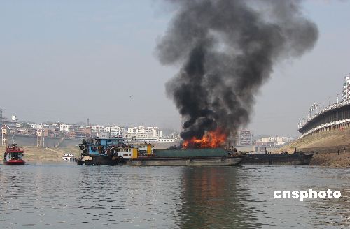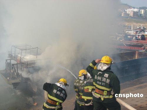 1月3日13時20分許,廣西梧州桂江上一艘貨船突然起火。由于火勢大,貨船噴出的火苗很快點燃停靠在旁邊的另一艘貨輪,并危及鄰近10多艘貨輪。梧州消防支隊調集水上中隊和河東中隊官兵奮戰(zhàn)近50分鐘,終于將大火撲滅,事故中無人員傷亡。據了解,當時起火貨船靠岸后船主上岸辦事,不料隨后船艙起火。中新社發(fā) 何永崇 攝