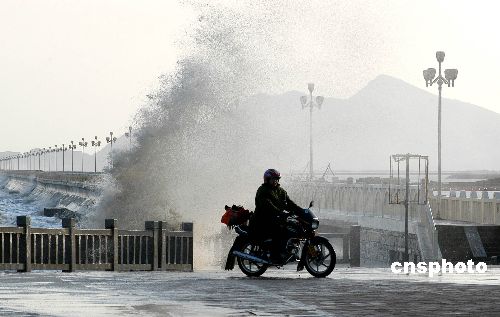 1月14日,江蘇連云港受北方冷空氣影響,海上出現7至8級偏北大風,沿海海邊出現巨浪,洶涌的海浪與岸邊的礁石相撞擊,卷起層層雪一樣的浪花,海邊港灣不時可見大風掀起10米多高的巨浪。 中新社發(fā) 王春 攝