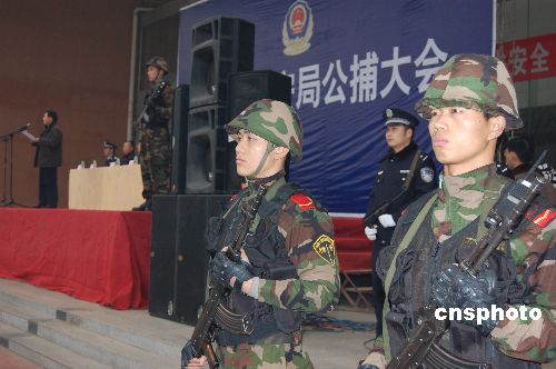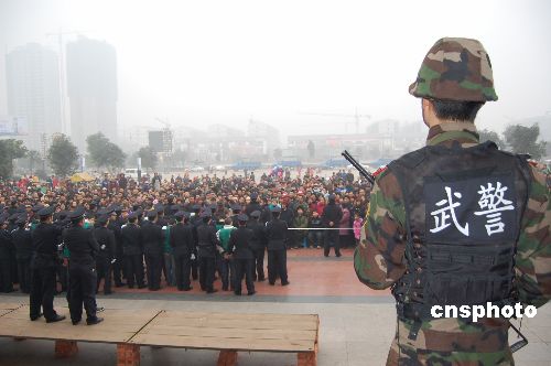 1月19日,四川岳池對(duì)縣城系列賓館盜竊案、鎮(zhèn)龍鄉(xiāng)故意傷害案、九龍鎮(zhèn)搶奪案、羅渡鎮(zhèn)販賣毒品案等15件涉嫌犯罪案件所涉及的30名犯罪閑疑人進(jìn)行了公開(kāi)逮捕,吸引了近萬(wàn)名群眾觀看。中新社發(fā) 胡佐斌 攝