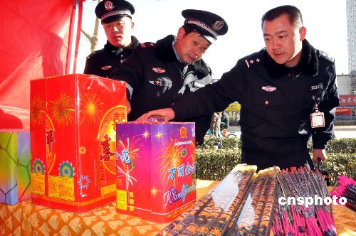 1月23日,為確保春節(jié)安全,鄭州市公安局金水分局組織治安、消防大隊(duì)、轄區(qū)派出所,全面展開(kāi)對(duì)煙花爆竹違規(guī)燃放、販運(yùn)和銷(xiāo)售煙花進(jìn)行嚴(yán)格檢查。截至目前,共清查集貿(mào)市場(chǎng)、街道鄉(xiāng)村攤點(diǎn)317余處。中新社發(fā) 劉書(shū)亭 攝
