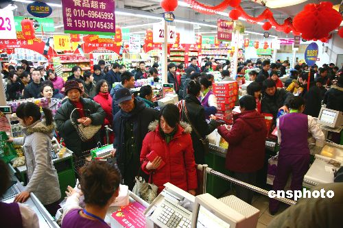 1月24日,北京市懷柔區(qū)“年貨”市場人潮涌動,市民紛紛走進(jìn)食品超市選購年貨,呈現(xiàn)出紅紅火火過大年的喜慶景象。中新社發(fā) 卜向東 攝