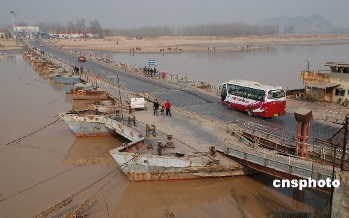 2009年1月29日,車輛從剛恢復(fù)通車的濼口浮橋上通過。由于近期氣溫回升,黃河濟(jì)南段流凌密度降至10%以下,截至上午8時(shí),濼口段流量保持在248立方米/秒以下,持續(xù)一個(gè)多月的凌汛已經(jīng)大幅度緩解。據(jù)濟(jì)南黃河防汛辦公室專家稱,近期黃河下游不會(huì)形成嚴(yán)重凌汛。濼口浮橋下游的章丘、歷程、濟(jì)陽(yáng)有10段封河,封河長(zhǎng)度在25公里左右。中新社發(fā) 滕越 攝