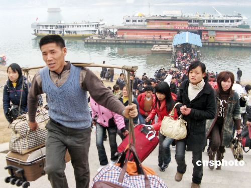 1月30日,10余艘出川客輪穿過(guò)三峽兩壩靠泊在湖北宜昌港,僅大公橋碼頭就有數(shù)千農(nóng)民工上岸分流,三峽春運(yùn)節(jié)后首波高峰如期而至。據(jù)了解,三峽農(nóng)的民工有逢陰歷雙日出門(mén)的習(xí)俗,因而高峰客流將兩天出現(xiàn)一次,一直持續(xù)到春運(yùn)結(jié)束。中新社發(fā) 韓玉洪 攝