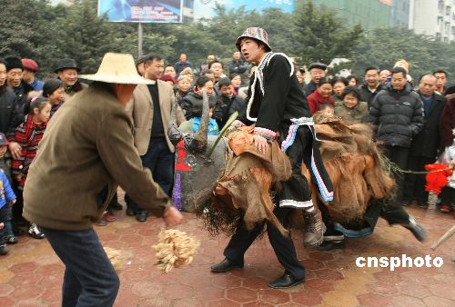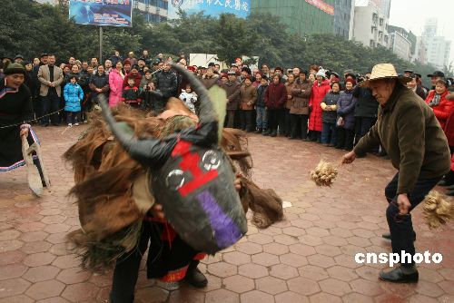 1月30日,農(nóng)歷正月初五,四川省洪雅縣瓦屋山鎮(zhèn)復興村84歲村民毛清全帶領該村10多名村民,到眉山市城區(qū)表演當?shù)孛袼住芭簾簟薄?/p>