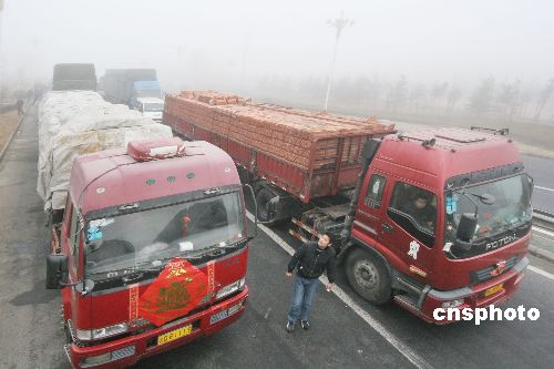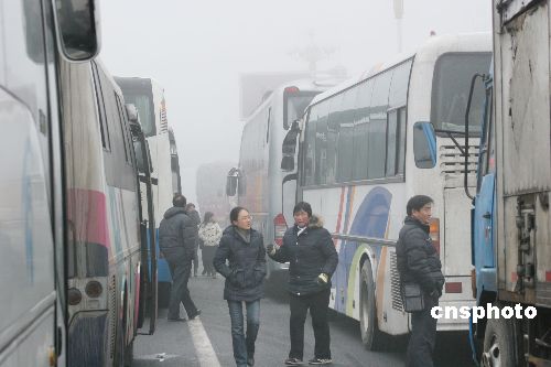 2009年2月1日上午,在同三高速公路江蘇省贛榆縣出口處,車(chē)輛等待霧散通行。連日來(lái),江蘇省大部分地區(qū)遭遇持續(xù)大霧天氣,部分地區(qū)能見(jiàn)度不足50米,給旅客出行及運(yùn)輸帶來(lái)影響。當(dāng)?shù)貧庀蟛块T(mén)發(fā)布大霧黃色預(yù)警,交通安全部門(mén)提醒旅客要注意出行安全。中新社發(fā) 司偉 攝