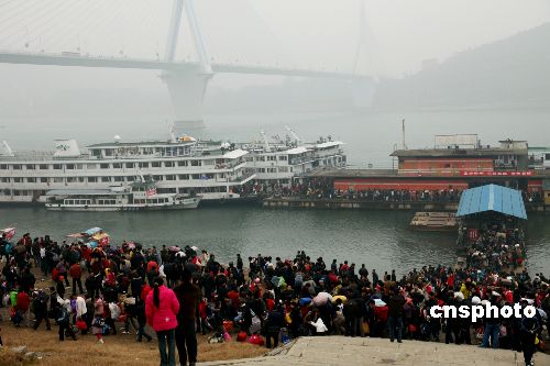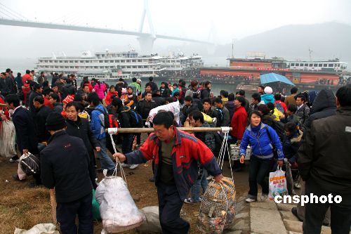 2月3日農(nóng)歷正月初九早8時(shí),長(zhǎng)江宜昌港大公橋客運(yùn)碼頭四條躉船無一客人、無一客船,9時(shí),9艘客船同一船閘、同時(shí)停泊宜昌港,一時(shí)間,涌入宜昌港口的出川大軍疏散成“井噴”之勢(shì)。宜昌海事、公安、港口等部門聯(lián)動(dòng)執(zhí)法,35分鐘時(shí)間內(nèi)緊急疏散4500余人,全部是出川農(nóng)民工。據(jù)統(tǒng)計(jì),三峽春運(yùn)期間,常年旅客進(jìn)出客流量約50萬人次,其中外出農(nóng)民工乘船超過40余萬人次。據(jù)悉,三峽庫(kù)區(qū)是長(zhǎng)江干線跨省春運(yùn)重點(diǎn)航線,而這一航線又是中國(guó)內(nèi)河農(nóng)民工乘船的專營(yíng)航線,節(jié)前單邊返鄉(xiāng)過年,節(jié)后單邊出川進(jìn)城打工,客船單邊旅客、客船高度集中,是中國(guó)內(nèi)河不多見的春運(yùn)現(xiàn)象。中新社發(fā) 望作信 攝