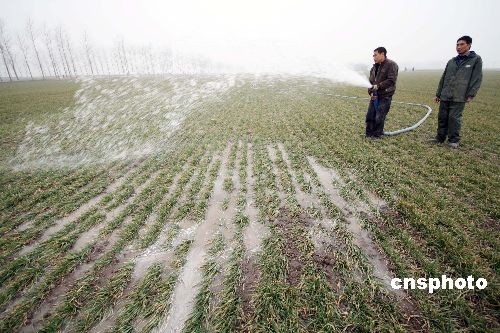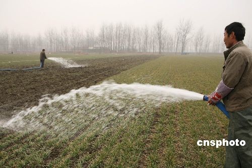 2月3日,安徽蒙城縣許疃鎮(zhèn)趙集村村民在澆灌麥田。2月2日,安徽蒙城氣象臺再次發(fā)布干旱紅色預(yù)警信息,針對當(dāng)前日益嚴(yán)重的旱情,安徽省蒙城縣再次掀起抗旱保苗的高潮,努力把旱災(zāi)損失降到最低限度。蒙城縣是全國糧食生產(chǎn)先進(jìn)縣,全縣小麥種植面積達(dá)165萬畝,自10月下旬以來,該縣已連續(xù)百日無有效降雨,土壤墑情迅速下降,加上連續(xù)發(fā)生三次寒潮,干旱和霜凍疊加在一起,致使小麥苗情不斷惡化,對越冬小麥生長極其不利,形勢十分嚴(yán)峻。面對旱情,蒙城縣上下積極行動,分別于去年12月中旬、1月上、中旬三次掀起抗旱保苗高潮,努力把旱災(zāi)損失降到最低限度。中新社發(fā) 胡衛(wèi)國 攝