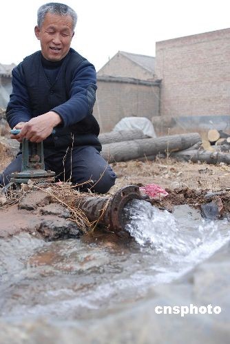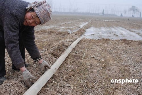 2009年2月4日,山西小麥產(chǎn)地運城新絳縣農民在全力以赴進行抗旱工作。入冬后,山西省受旱面積達3274萬畝,其中山西小麥主產(chǎn)區(qū)運城、臨汾兩地農作物受旱面積達634萬畝,同時有106萬群眾及19萬頭牲畜出現(xiàn)飲水難問題。2月3日,山西省政府防汛抗旱指揮部已發(fā)布干旱橙色預警(Ⅱ級)并啟動響應行動。山西省財政緊急下?lián)芸购蒂Y金1000萬元。中新社發(fā) 高新生 攝