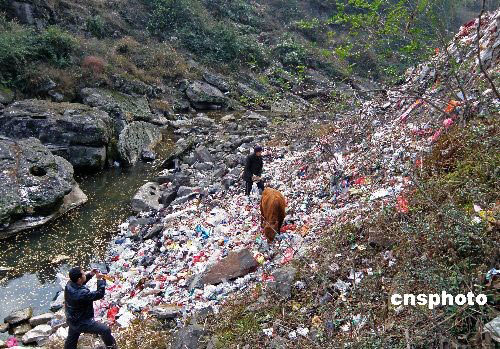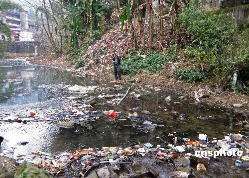 2月4日,重慶市云陽縣新陽鄉(xiāng)新陽小鎮(zhèn),被各種垃圾污染后的新陽小河令人觸目驚心。據(jù)了解,新陽小河是長江三峽庫區(qū)的小支流,是飲用水源一級保護區(qū),由于沒有垃圾處理站,當?shù)鼐用窦敖值拉h(huán)衛(wèi)人員習慣把垃圾直接倒在河邊及河中,洪水季節(jié),這些垃圾將被洪水沖入三峽水庫。中新社發(fā) 劉君鳳 攝