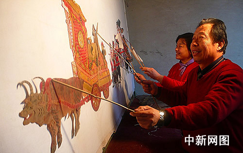 中新網(wǎng)2月6日電(馮文芳)2月5日,山西省侯馬市西侯馬村,皮影戲傳承人李世偉、皮影雕刻大師趙翠蓮夫婦耍起牛車(chē)和影人,表演皮影戲《鬧社火》,慶祝傳統(tǒng)元宵佳節(jié)。夫婦倆邊操作邊演唱,字正腔圓的唱段、妙趣橫生的臺(tái)詞、活靈活現(xiàn)的表演,受到鄉(xiāng)親們的歡迎。人們紛紛落座觀看,盡情享受這一獨(dú)具魅力的民間文化大餐。