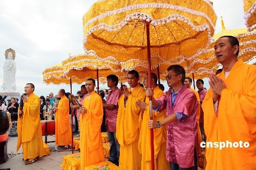 2月9日元宵節(jié),海南三亞南山寺全體僧眾在三亞南山文化旅游區(qū)內的108米南海觀音圣像前舉行祈福法會,共唱佛贊,并放飛和平鴿,祈愿國泰民安、萬家團圓。本次祈福法會吸引了近3000多名信眾和游客參加。中新社發(fā) 陳文武 攝