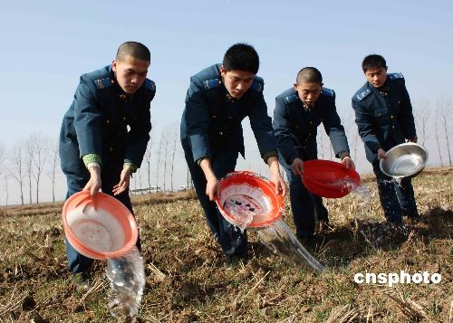2月10日,官兵正在幫助駐地群眾澆灌麥苗抗旱。連日來,濟(jì)南空軍某飛行學(xué)院官兵在全力以赴協(xié)助地方政府搞好人工增雨工作的同時(shí),成立了多支抗旱救災(zāi)黨員突擊小分隊(duì),千余名官兵深入到駐地農(nóng)村田間地頭幫助群眾安裝水泵、疏通渠道、澆灌引水,支援地方抗旱保苗,最大限度地減少旱災(zāi)造成的損失。中新社發(fā) 耿國(guó)慶 攝