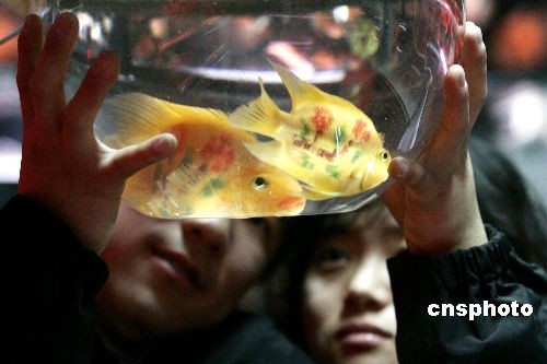 2月13日,情人節(jié)到來(lái)之際,北京許多商家推出種類(lèi)繁多的情人節(jié)商品。圖為在北京一花鳥(niǎo)魚(yú)蟲(chóng)市場(chǎng),店主將熱帶魚(yú)全身用激光紋身的方法紋上玫瑰花,以吸引顧客的眼球。中新社發(fā) 富田 攝