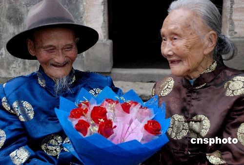 2月14日,江西樂平市禮林鎮(zhèn)黃家村102歲老人黃德勝與96歲老伴程銀枝手捧該市民政局、老齡委工作人員贈送來的玫瑰花,臉上露出喜悅之情。當日是“情人節(jié)”,樂平市民政局、老齡委聯(lián)合開展了“玫瑰花贈送百歲老人”活動,把玫瑰鮮花、奶粉、桃酥等慰問品贈送到該市6位百歲老人手中,以祝福他們晚年幸福、健康長壽。中新社發(fā) 朱定文 攝