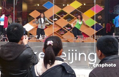 2009年2月21日,北京王府井某商場(chǎng),兩位模特在櫥窗內(nèi)激情表演動(dòng)感十足的舞蹈,以此吸引過(guò)往行人的目光,為商場(chǎng)增添人氣。中新社發(fā) 玉龍 攝